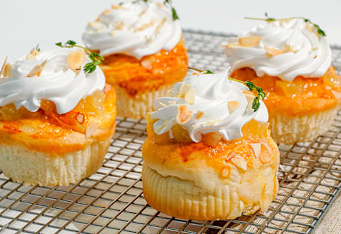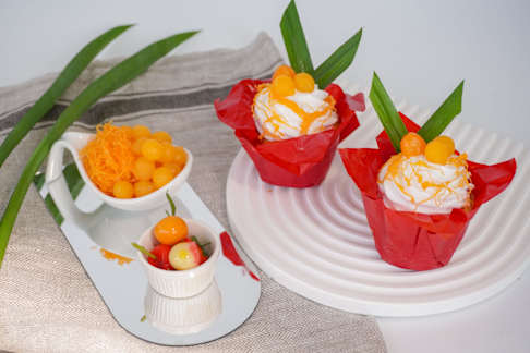 ทาร์ตกล้วยไข่ คาราเมลน้ำตาลโตนด เมนูขนมหวานในสไตล์ฟิวชั่น หน้าตาน่ารับประทาน วิปครีมนุ่มละมุนหวานน้อยกำลังดีเข้ากับกล้วยไข่หวานๆ ได้อย่างลงตัว