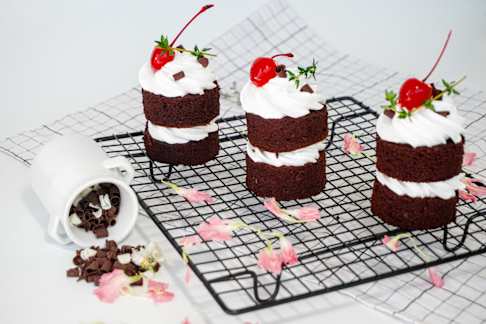 Mini Black Forest Cake เค้กเล็กขนาดพอดี เป็นเค้กแบบคลาสสิคที่นิยม มีการตกแต่งด้วยวิปครีมระหว่างชั้น และตกแต่งด้วยเชอรี่ก้านมาราสชิโน