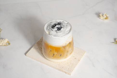 คาราเมลเซซามิลาเต้ เมนูกาแฟหอมคาราเมลและงาดำ มาในสูตรของลาเต้ แต่งเติมโฟมครีมและงาดำ ทอปด้านบนอย่างลงตัวด้วยไอซ์ฮอท เบเวอเรจ ทอปปิ้ง