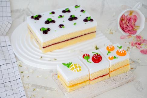 นำเค้กสปันจ์วานิลลา วางลงบนแผ่นรองเค้ก ปาดไส้บลูเบอร์รี่ 15 กรัม ให้ทั่วด้านบนเค้ก บีบวิปครีมทับลงไป 20 กรัม ปาดให้ทั่วนำเค้กสปันจ์วานิลลา